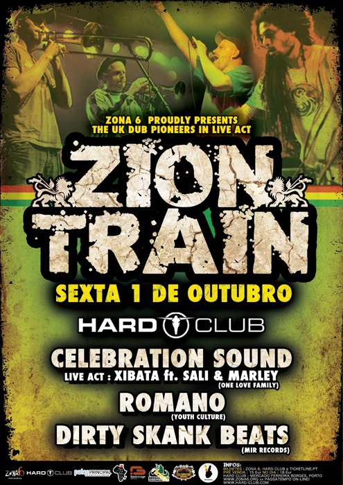 No próximo dia 1 de Outubro - Dia Mundial da MÚSICA - a ZONA 6 tem o prazer de apresentar a primeira grande festa de Dub & Reggae nos palcos do HARD CLUB com os pioneiros do UK Dub e líderes há quase 2 décadas do movimento Dub europeu, ZION TRAIN. Para continuar a noite um elenco nacional de luxo com alguns dos mais carismáticos Selectas e Tooster's do Reggae Nacional.